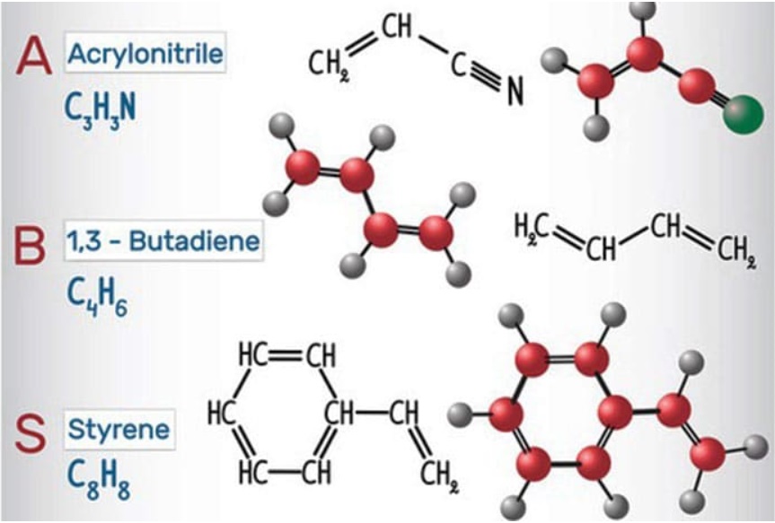 Nhựa ABS có thành phần cấu tạo chính từ 3 chất đó là Acrylonitrin, Butadien, Styren, công thức hóa học là (C8H8.C4H6.C3H3N)n, vì vậy, được viết tắt là ABS.