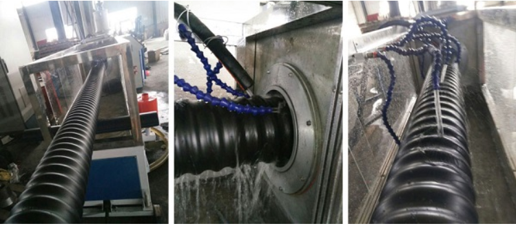 - Bước 3 – Thành hình: Nhựa chảy qua khuôn nóng tạo hình cơ bản của ống gân xoắn. Tiếp theo, nhựa sẽ kết hợp khuôn lạnh để định hình ống. Để quá trình này diễn ra nhanh, ống nhựa được tròn và đều gân thì máy phun nước làm lạnh được bật lên giúp sản phẩm được như yêu cầu.