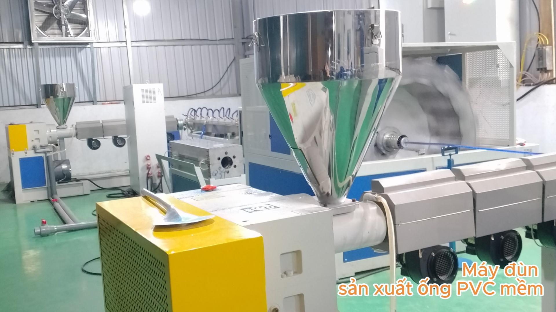 - Máy đùn 1: đùn ra phần nhựa (bên trong lớp lưới), sau đó ống lưới pvc mềm được đi qua máng nước làm mát định hình và được sấy khô