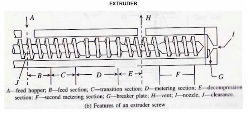 Cụ thể, độ sâu giảm ở phần D (metering section: khu nóng chảy) vì vậy lực cắt lớn tác động vào vật liệu. Do lực cắt mạnh, nhiệt lượng tăng nên vật liệu sẽ nóng chảy ở khu vực này. Vật liệu nóng chảy có độ nhớt cao sẽ được bơm chuyển tiếp đến khu vực tiếp theo khu E (decompression section: khu giải nén). Tại khu giải nén, độ sâu tăng, lực cắt giảm, vật liệu được làm giảm độ nhớt. Nếu có hơi nước ngưng tụ sẽ được loại bỏ qua lỗ thông hơi (H: vent).