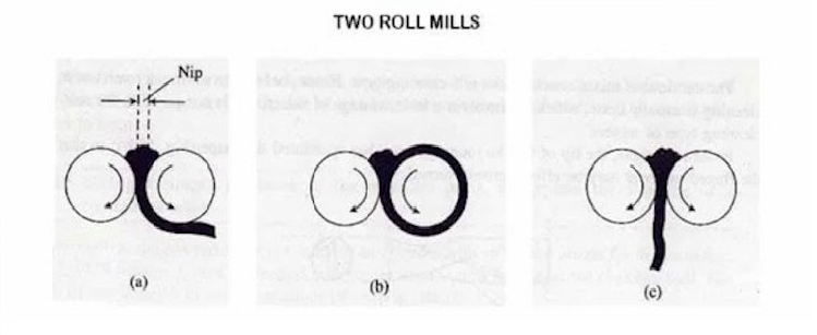 Thông thường, vật liệu sẽ di chuyển từ cuộn bên này sang cuộn bên kia rồi về lại nhiều lần (xem hình 6 để dễ hình dung). Sau mỗi lần nghiền, kích thước nip được giảm xuống để cán mỏng và đều vật liệu hơn. Quá trình trộn kiểu này sẽ thu được một hợp dính, dẹt, bản lớn.