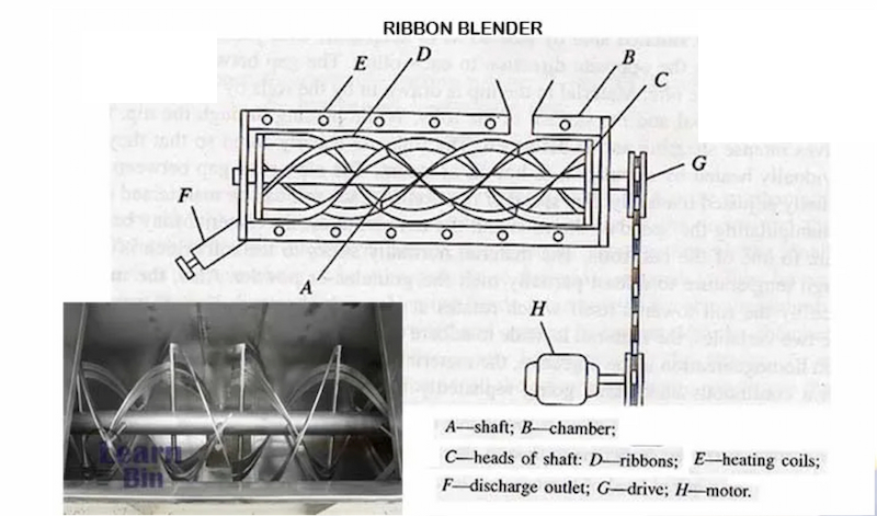 Những dải “ruy băng kim loại ” này được đặt sao cho gần như chạm vào thành khoang. Nó tạo ra một lực cắt lớn cho vật liệu. Ở máy trộn này, cấp nguyên liệu không liên tục mà theo mẻ nên tốc độ trộn ở mức trung bình. Máy có các điểm làm nóng để dễ trộn các các vật liệu nhớt, bùn nhão. Ngoài ngoài ra các vật liệu khô cũng trộn được trong máy loại này.