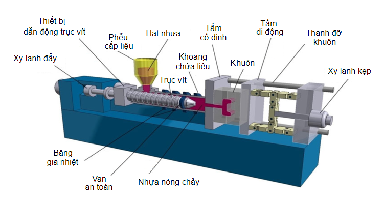 - Dưới tác dụng của nhiệt độ và áp suất, nguyên liệu trong khuôn sẽ chuyển dần từ trạng thái hạt và bột sang trạng thái mềm, dẻo và kết dính tốt tạo thành hình dạng sản phẩm mong muốn.