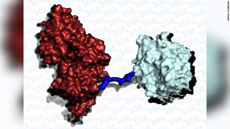 Hai enzyme MHETasevà PETase (tương ứng là màu đỏ và xanh lam) liên kết với nhau. Ảnh: CNN